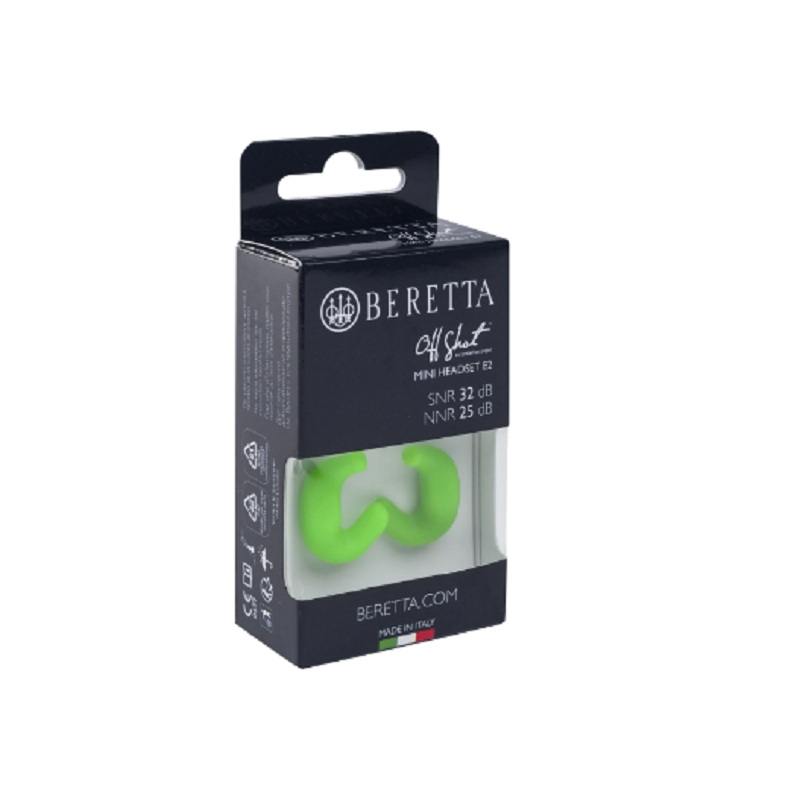 Mini Headset E2 zaručují ochranu proti hluku 32 dB SNR. Měkký silikon se přizpůsobí tak, aby se pohodlně přizpůsobil jakémukoli tvaru ucha. Ergonomický tvar je činí stabilními během používání. Bezpečnost Společnost Beretta a její oddělení výzkumu a vývoje již léta neustále investuje do navrhování technologicky vyspělých řešení příslušenství ve spolupráci s průmyslovými partnery na ochranu zraku a sluchu lidí při střelbě a lovu. Po spolupráci s odborníky a provedení terénních testů se sportovci ve střelbě na terč, Beretta přišla s kolekcí brýlí a zařízení na ochranu sluchu (mušlové chrániče sluchu a sluchátka) pro civilisty, nadšence i profesionály. Neustálý výzkum nových technologií a důkladná pozornost věnovaná detailům zajišťují vysokou úroveň ochrany a výkonu. Vlastnosti 32db ochrana SNR Balení obsahuje: silikonové komfortní špunty do uší, jeden pár na velikost (S, M, L), snadno se čistí Nastavitelná, odnímatelná šňůrka se zátkou Měkké pouzdro z mikrovlákna Složení 100,0% termoplastický elastomer